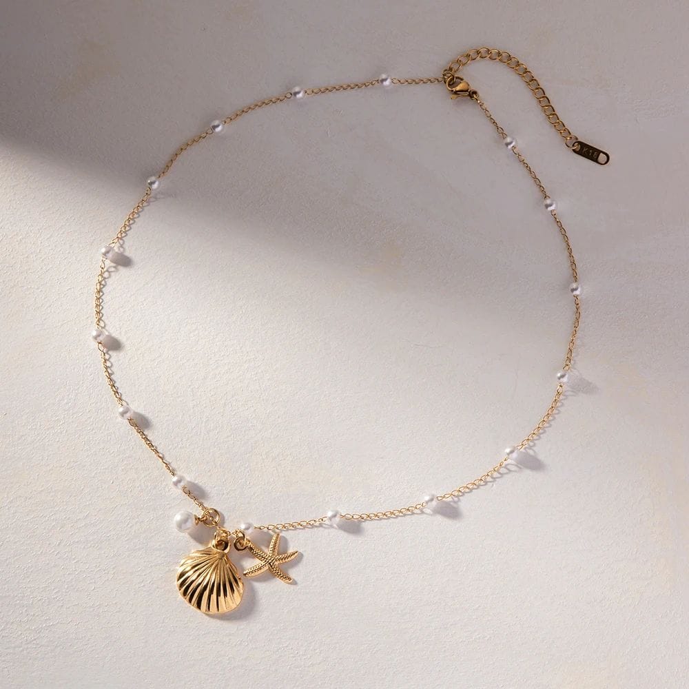 Our Pearl Necklace is inspired by the Ocean and is part of our By the Sea Collection.  This beauty comes with a pearl studded chain and three charm pendants. Make your mermaid dreams come true with this beautiful necklace. Treasures from the Sea for you to wear encrusted in gold.