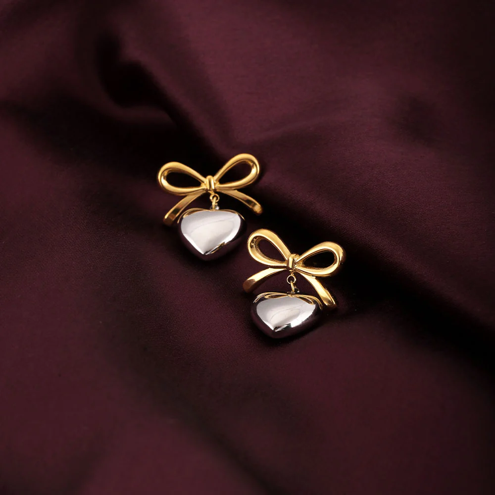 Enhance your style and spread love with our Vanessa Bow Heart danglers. Trendy bow detailing with a touch of Love these earrings are going to steal your heart and make your coquette dreams come to life.